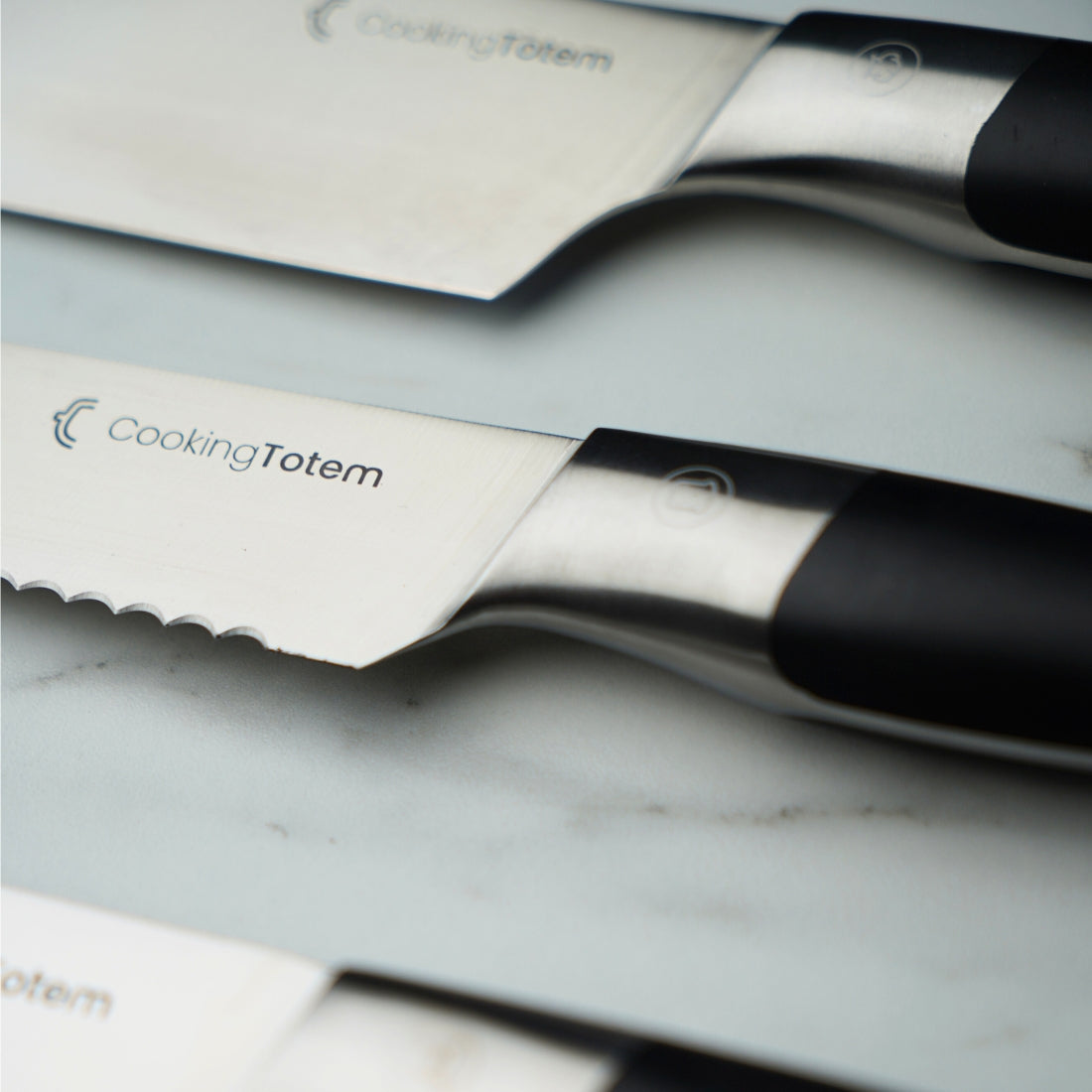 De messen van CookingTotem hebben een levenslange garantie tegen fabrieksfouten. Deze garantie dekt geen schade door onjuist gebruik, ongelukken, verlies, of diefstal. Schade door snijden op harde oppervlakken, wrikken, draaien, buigen, snijden van bevroren voedsel of voedsel met een harde schaal, valt niet onder de garantie. Ook schade door vaatwasser gebruik, langdurig onderdompelen in water, niet direct afdrogen na het wassen, of gebruik in een foodservice-omgeving, is uitgesloten. Verder dekt de garantie geen botte messen, roest, verkleuring, of verbogen, gebroken, of gescheurde mesjes.