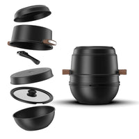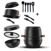 - Koekenpan 25,5 cm en 1,7 L, soeppan 29 cm en 6,1 L, sauspan 20cm en 2,1 L grillpan 29 cm en 2,5 L, universele deksel 20 cm die op de soeppan, wokpan en grillpan past, wokpan 29 cm en 4,8 L en twee afneembare handvatten.