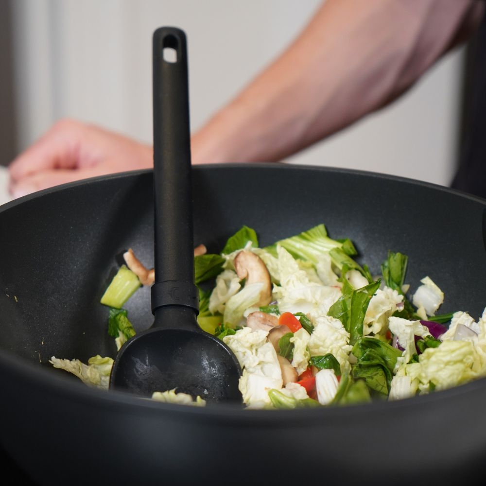 De flexibele siliconen kop is perfect voor het roeren door sauzen of wokgerechten en het maken van beslag. Dankzij het zachte siliconen voorkom je krassen in je pannen en haal je moeiteloos de laatste restjes eruit.