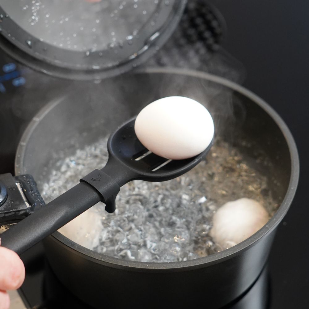 De brede, stevige spatel is perfect voor het omdraaien van vlees, groenten of een omelet. Dankzij het flexibele uiteinde kom je gemakkelijk onder je burger of andere gerechten, zonder ze te beschadigen.