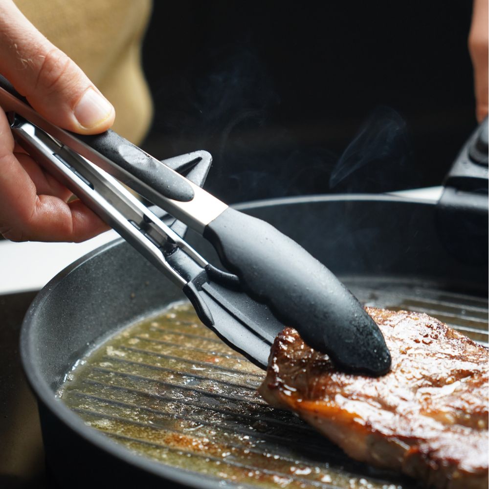 Het vergrendelbare handvat zorgt voor ruimtebesparende opslag en maakt de tang gemakkelijk in gebruik. Ideaal voor het draaien van vlees en groenten.