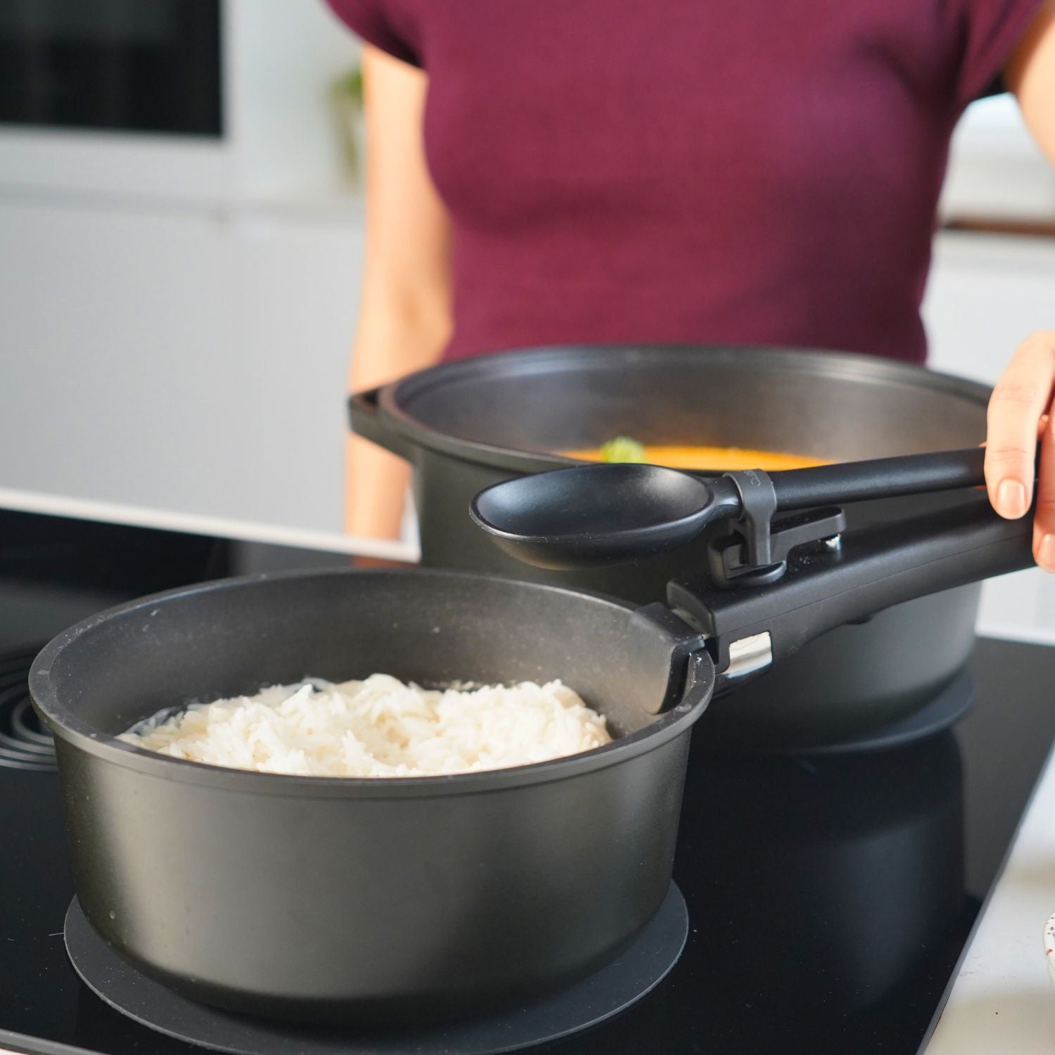 uit die frustratie ontstond de CuliStack panennset: een modulair kook- en opbergsysteem dat structuur en rust brengt in de keuken. De pannen stapelen compact tot minder dan 30 centimeter hoog en passen moeiteloos in vrijwel elke lade of kast. Elk onderdeel, van pan tot deksel, is ontworpen om logisch samen te werken en ruimte optimaal te benutten.