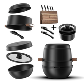 • Koekenpan 25,5 cm en 1,7 L, soeppan 29 cm en 6,1 L, sauspan 20cm en 2,1 L grillpan 29 cm en 2,5 L, universele deksel 20 cm die op de soeppan, wokpan en grillpan past, wokpan 29 cm en 4,8 L en twee afneembare handvatten.